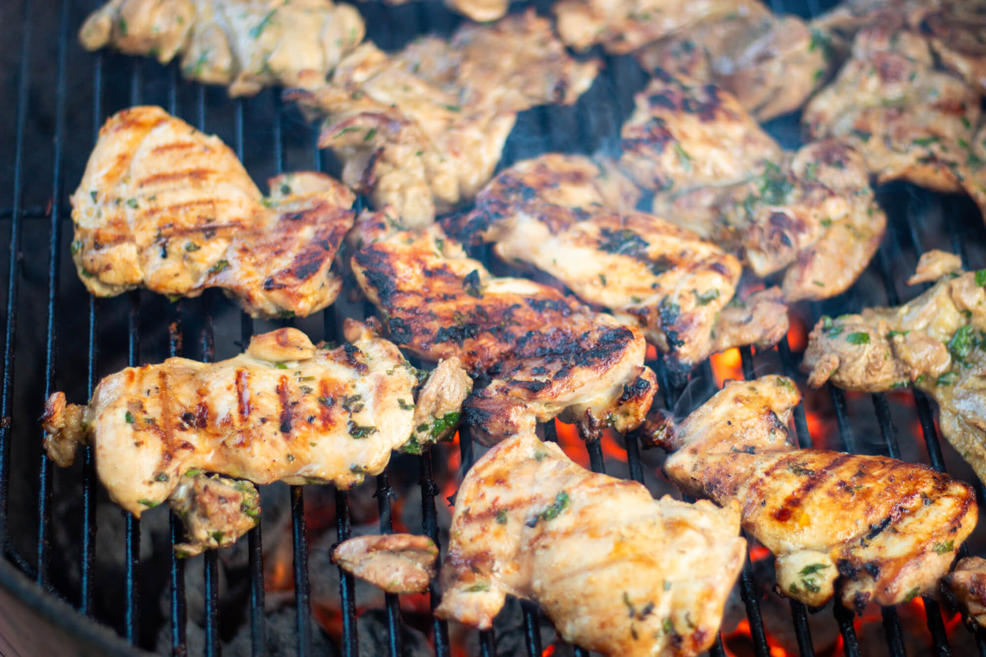- The ideal way to cook the chicken is on a grill heated to medium (you can keep your hand hovering 3 inches over the grates for about 4 seconds). Remove the chicken from the marinade and discard the marinade. Grill turning every 3 minutes or so until cooked through and registers about 160 F on an instant meat thermometer. Thighs are very forgiving but be very vigilant if you are using chicken breasts so that they do not dry out. For chicken thighs the cooking time total is around 10 minutes (I use a Weber charcoal grill), but your grill will be different so rely on your thermometer. The chicken should be very well browned and charred in a few spots.