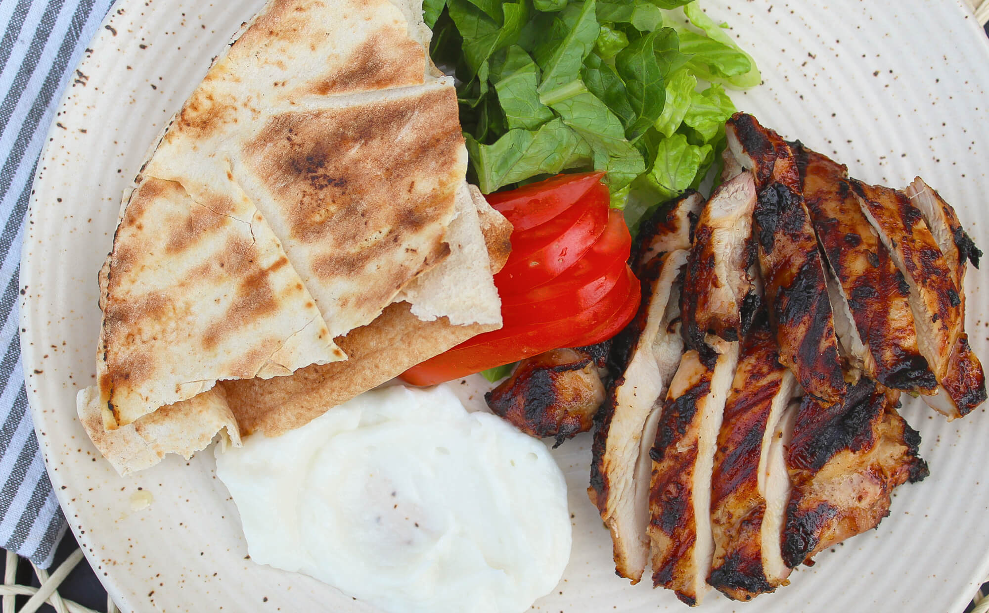 - Let the chicken rest for 10 minutes and slice into ½ inch thick strips. Tuck in pita bread with plenty of Toom (whipped garlic condiment), shredded lettuce, tomatoes and pickles. Adding French fries to the pita wrap is also traditional.