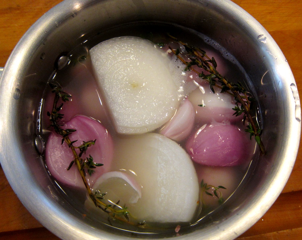 For a tasty garnish I went with whey-cooked shallots. This is just whole peeled shallots and an onion simmered slowly in a mixture of whey and butter along with some thyme. The mixture cooks until all the liquid evaporates and the onions are golden meltingly soft and a bit caramelized. To serve, I sliced the pork and used a biscuit cutter to make neat disks. I browned them in a hot pan till crispy on the outside. The cavatelli were tossed with peas and butter. I plated the meat with the pasta around it and topped with the shallots.