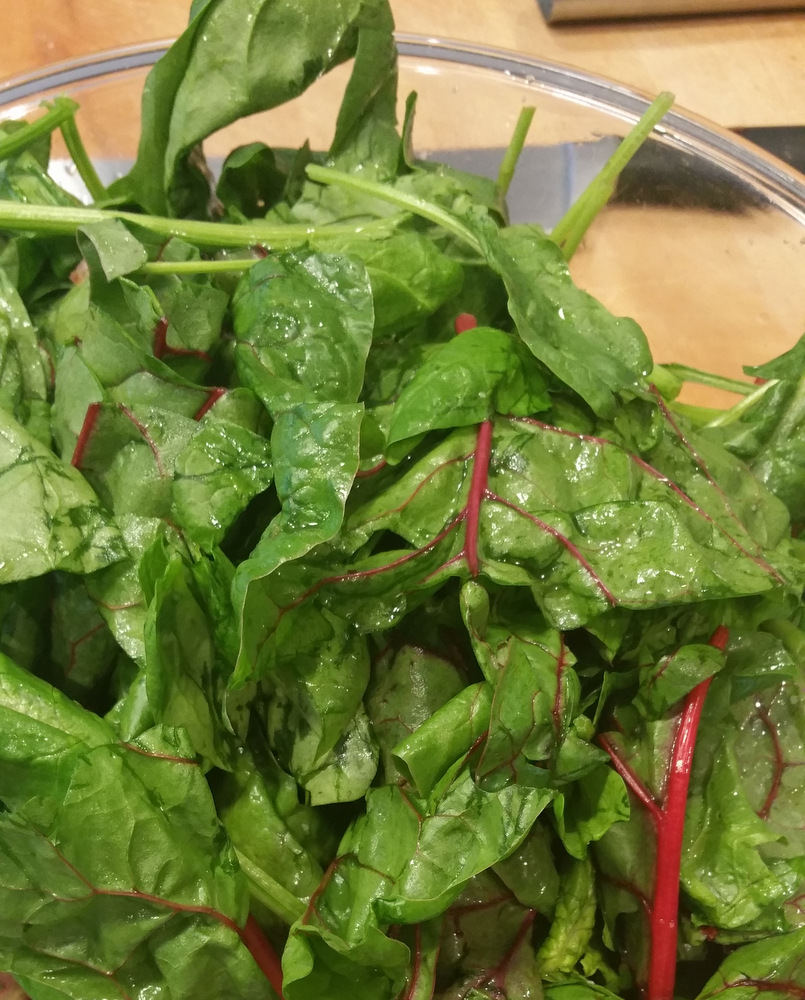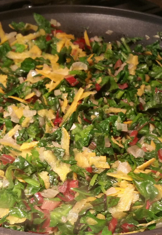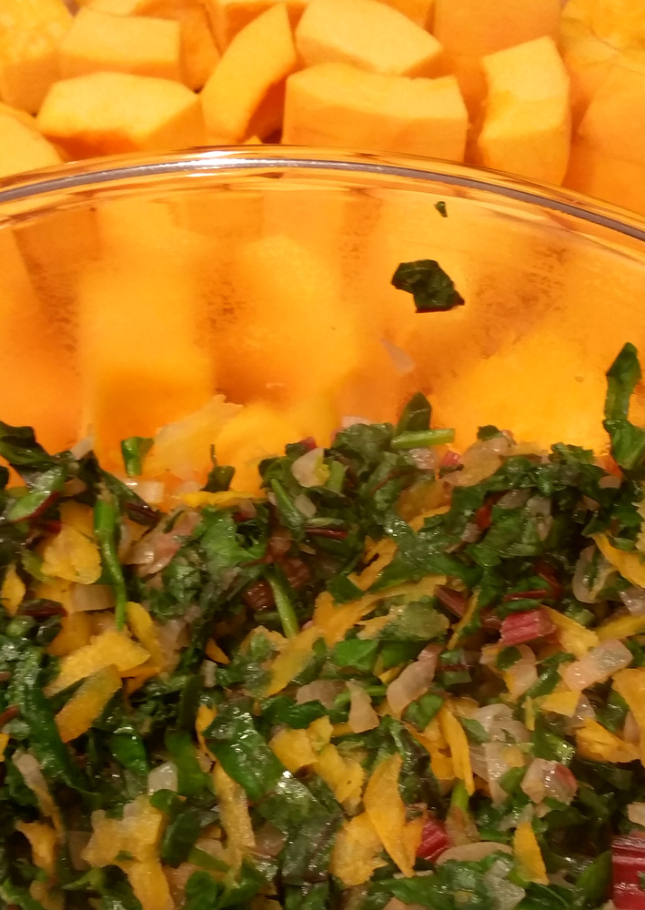 Spinach and swiss chard made up the greens portion of the filling. The most important step is to make sure these are very very well washed. There is nothing more irksome than grit in an otherwise delightful dish (same goes for removing the poop “vein” from shrimp…I hate it when lazy cooks leave it in and we get nasty grit!) Anyways, back to the filling. I shredded a few handfuls of a small pumpkin using the coarse side of the grater and tossed these in some salt for a bit. The same salting treatment was used for the coarsely chopped greens. The salt draws out some of the water and helps reduce the astringency of the raw greens.