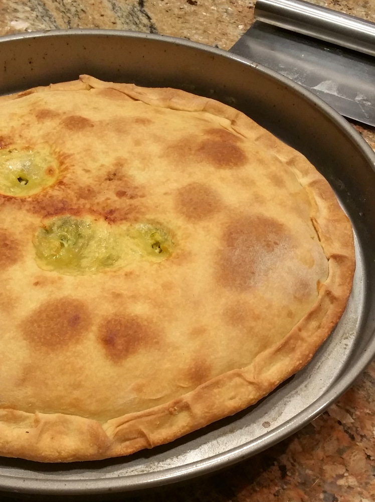 After rinsing and draining the greens I sauteed them with onions and olive oil until wilted but still retained their firmness. I tossed in the shredded pumpkin and cooked that for a few minutes too. Once the mixture is cooled, I added a bit of short-grain rice that was soaked in water for 30 minutes, Parmesan cheese, fresh mozzarella and a couple of eggs. I rolled the dough into large 14-inch rounds and topped one with the filling before covering it with the second round. I debated building the whole thing on a pizza peel and sliding it on my baking steel directly. I decided against that and went with building and baking the torta on a round metal baking pan. Next time I might give baking it directly on the baking steel a shot and see what happens (hopefully no burnt dough or a huge mess). My favorite way to enjoy this pie is at room temperature, sliced into wedges and eaten by hand. It is delicious, satisfying and keeps well. It makes lovely meals for days if you do not polish it off the first night.