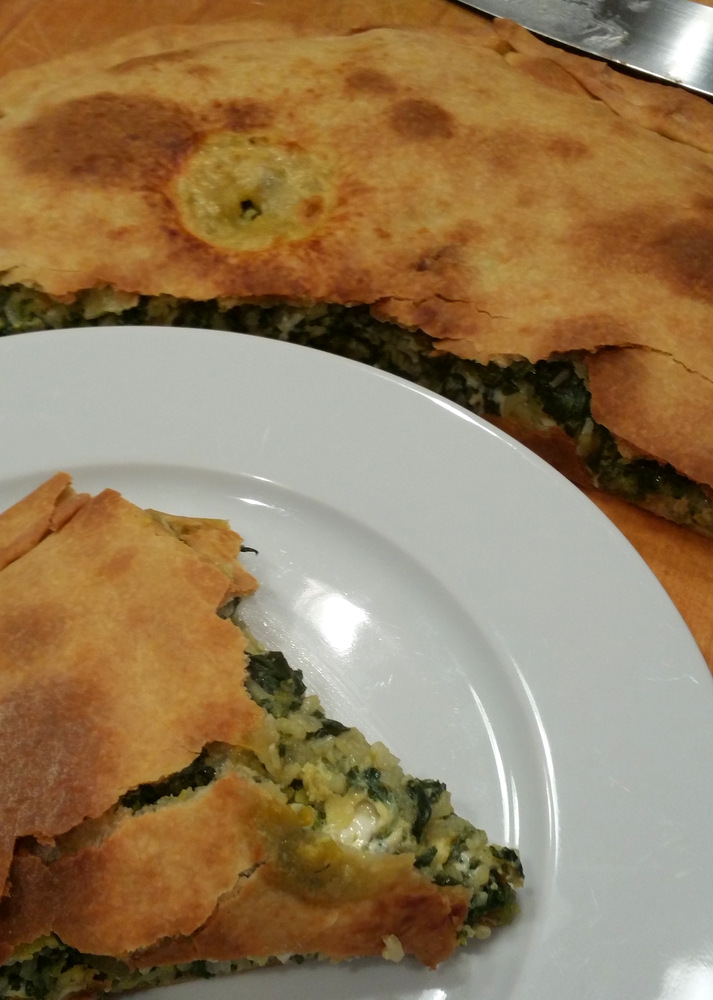 If I had to pick all time favorite vegetarian meals they would have to be Mediterranean. They probably focus on lots of greens and wrapped in thin flatbread or dough (proper Falafel is probably on the top of that list). This Italian gem of a recipe from Paula Wolfert is one of those recipes and I’m happy to write about it at this time since it seems very autumnal.