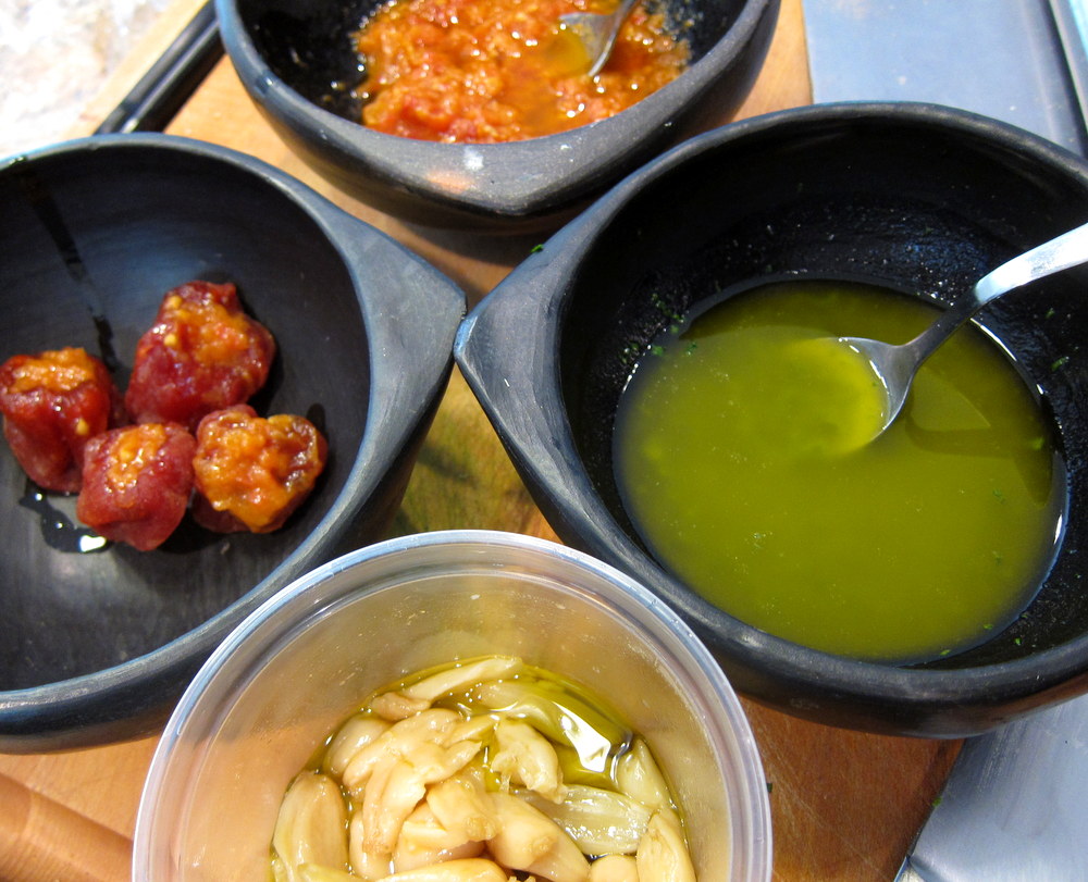 Soaking a fruit or a vegetable in pickling lime or Calcium Hydroxide is a theme in the Mugaritz book. Soaking any vegetable in a mixture of water and pickling lime binds the cellulose and makes the fruit firm. The longer it is soaked the harder a shell it forms. The reason pickling lime is sold is -as the name suggest- keep those bread and butter pickles from getting mushy in the pickling liquid. Vegetables soaked in lime can withstand a good bit of cooking while remaining firm and never turning mushy. Chef Aduriz uses it in many recipes from making “calcified” branches of salsify to the traditional candied pumpkin cubes. The flavors here are very familiar. We have tomatoes, olive oil, garlic and herbs but the texture and look are certainly not what your typical tomato salad is like.