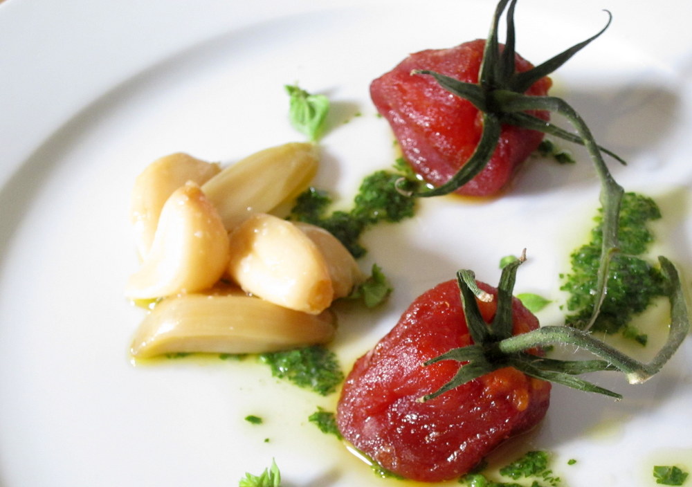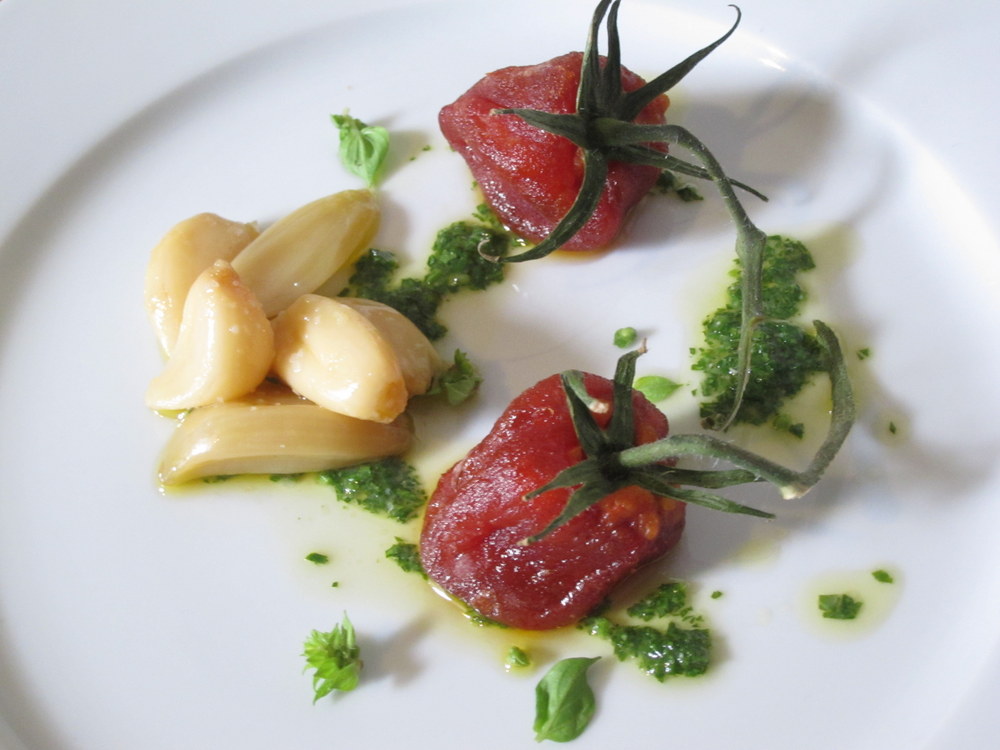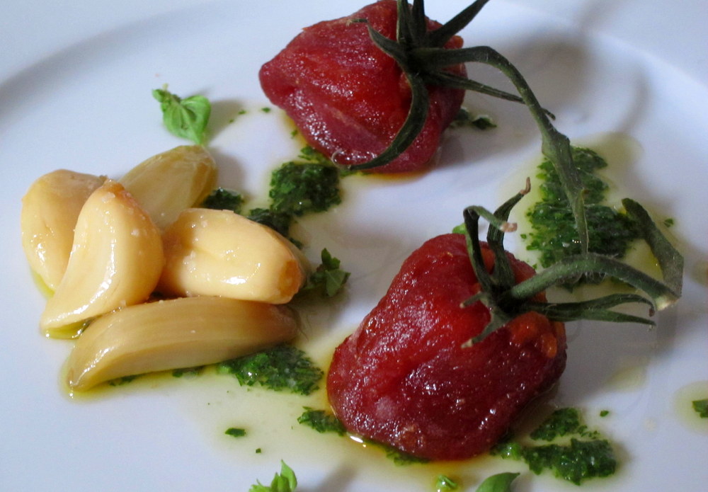 To plate, I stuffed the tomato shells with the tomato emulsion mixture and “closed” each one with a reserved tomato stem. a bunch of garlic cloves go on the side along with a few small herbs. I whipped the dressing from olive oil, cider vinegar, white miso and parsley and drizzled it all over the salad. It goes without saying that the flavors are excellent together. The texture was terrific and new. The tomatoes were not like sun-dried tomatoes but had a nice soft chew to them that was very nice. I was worried that the syrup the tomatoes are cooked in would make them too sweet but that was not the case. The flavors were perfectly balanced with mild sweetness, acidity, very deep tomato flavor (from all the roasting, drying and concentrating) and fragrant garlic and herbs.