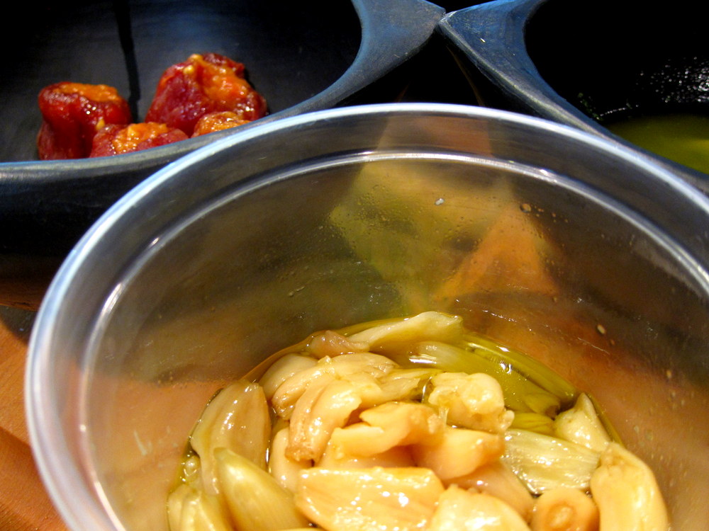 To go with the tomato salad we have a whole boatload of slow roasted garlic cloves. This is just like it sounds. Gently roast garlic heads wrapped in foil in the oven until soft and deliciously sweet. I peeled them and tossed them with a good amount of olive oil.