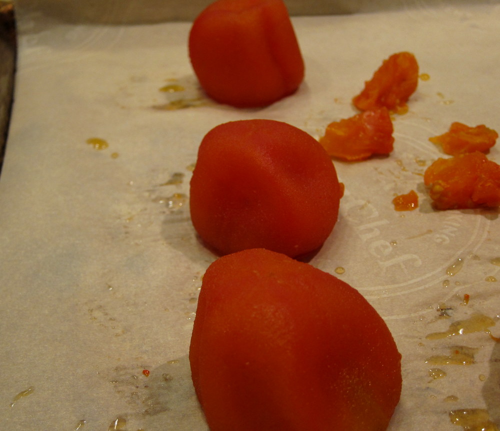 While the tomatoes were dehydrating I worked on the filling and the garlic. The filling is made from large beefsteak tomatoes. The recipe had some slightly vague instructions to roast the tomatoes over fresh coals. I decided to broil them and roast them instead to get some char on them and also get them very soft. When fully cooked I got rid of the seeds and mixed the tomato pulp with olive oil, salt, minced garlic to form a good emulsion.