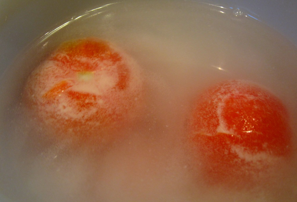 I blanched the tomatoes and peeled them first. I then soaked them in a mixture of water and pickling lime for several hours. The lime has a tendency to settle, so I needed to stir it every so often. By the end of the soaking time you could feel how firm and rough the tomatoes are on the outside. Next step is to cook them in a mixture of sugar and water.