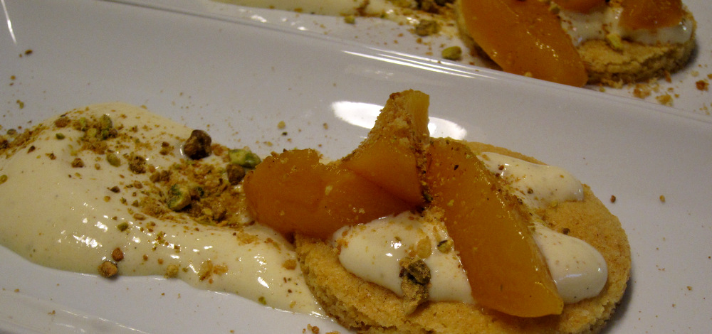 The peaches are the easiest part. I quickly blanched them, peeled them and cut them into wedges. These got poached gently in a sugar syrup flavored with vanilla. To plate I dispensed some of the well-chilled custard into a bowl and topped the Sablè Breton with a spoon of it. I added more custard to the plate and topped the dessert with poached peaches and toasted crumbled pistachios. The flavors and textures were fantastic.