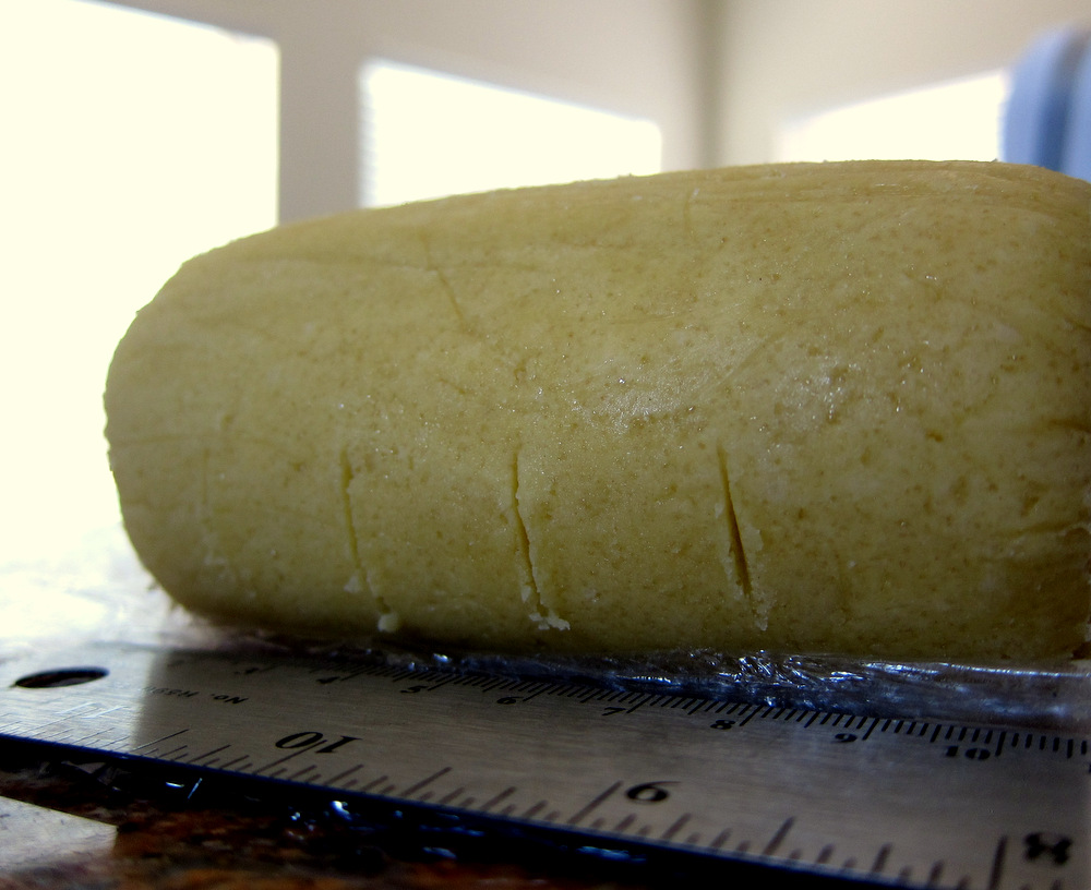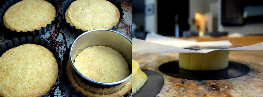 For the cookie portion, I used a recipe from Gordon Ramsay’s Gordon Ramsay: Three Star Chef book for Sablè Breton. This is a slightly sweet buttery pastry that is used to make tarts and cookie sandwiches. Due to the high butter ratio in the dough the cookies tend to spread if not baked in a ring mold. I wanted them to be nice and round. so I rolled the dough into a thick log and sliced it. Then I gently squashed the dough circles to flatten them between the bases of two small (about 3 in. diameter) tart pans. I baked the cookies in the tart pans and then used a cookie cutter to trim them into neat 2 inch circles while they are warm out of the oven.