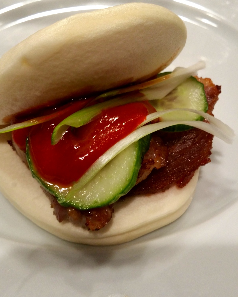 I was thinking of making my own buns for this but timing just did not work out. Besides I was at the Asian grocery store that day and they had a good selection of these things in a couple of different sizes. So all I had to do was steam them and they were good to go. Last thing to prepare, while steaming the buns, is the instant “pickles”. These are really more like marinated cucumbers. Thin sliced cucumbers are tossed in some sugar and salt. They sit for 15 to 30 minutes are good to go.