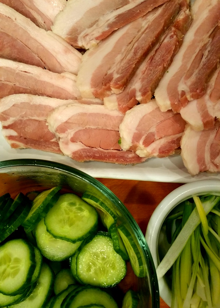 Get the pork sliced and crisped a bit and tuck into a soft steamed bun along with hoisin sauce, sriracha (or sliced jalapenos or both!), sliced green onions and some of those marinated cucumbers.