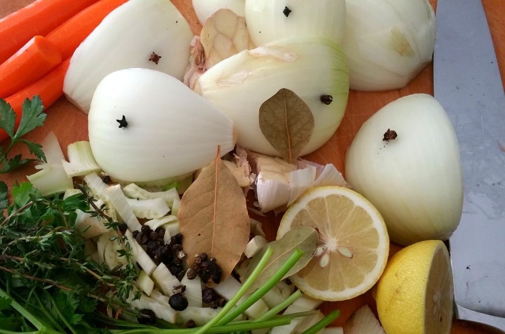 I clarified the reserved stock the traditional way following McLagan’s instructions as opposed to using Agar. It’s good to practice the classic techniques every so often and I believe the classic method reserves more of the gelatin in the stock and that’s essential to ensuring the dish sets properly. So I stirred the stock with egg whites and minced vegetables and brought the mixture to a gentle simmer. As the protein in the egg white coagulate it glues together all the minced vegetables and forms a raft on the surface that filters any impurities from the liquid and clarifies it. The liquid is then gently strained through cheesecloth. It is pretty much crystal clear and has an awesome full flavor.