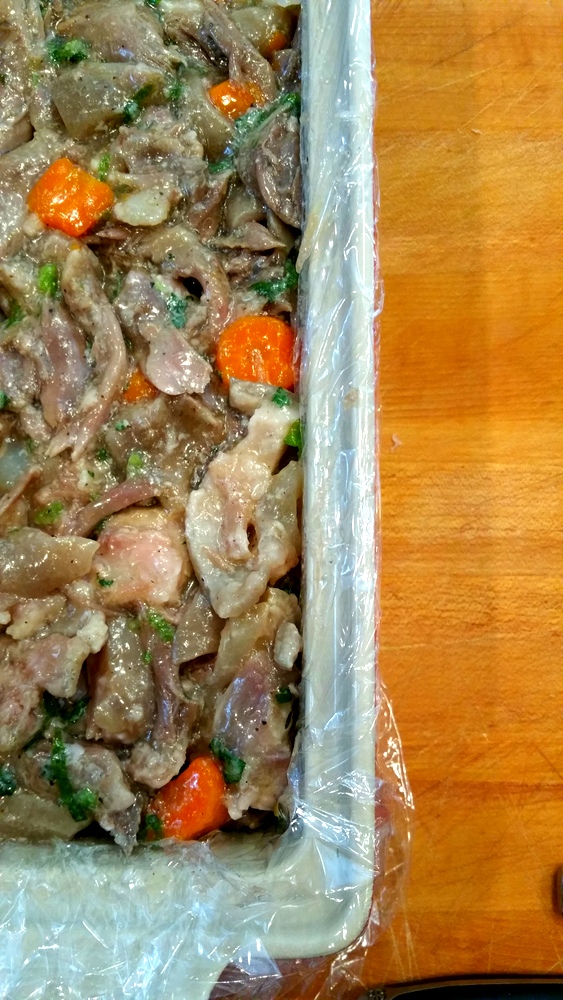 The picture for the one with carrots looked very cool and I figured the vegetables will make this rich terrine even more appealing. So, I went somewhere in the middle and used a combination of both recipes. I included plenty of skin and such but also made sure to cut up the carrots from the cooking stock and include them.