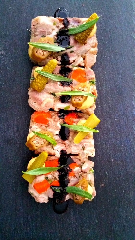 The first step here is to brine the pig’s head in a spiced brine for three of days. It is then cooked it in a big pot of water along with split pork trotters, herbs, spices, lemon, aromatics and peeled carrots. The stock is saved for the next step and the meat gets picked off the bone. I cut up all the meat, skin, ear and set it aside.